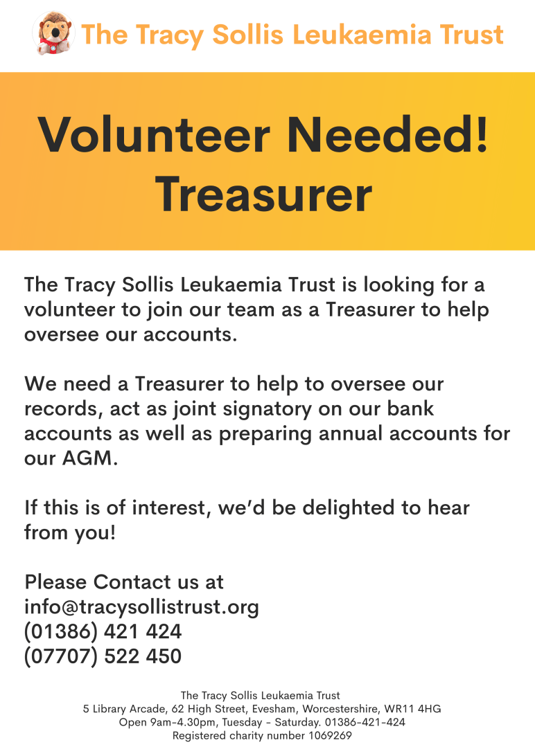 The Tracy Sollis Leukaemia Trust is looking for a volunteer to join our team as a Treasurer to help oversee our accounts.