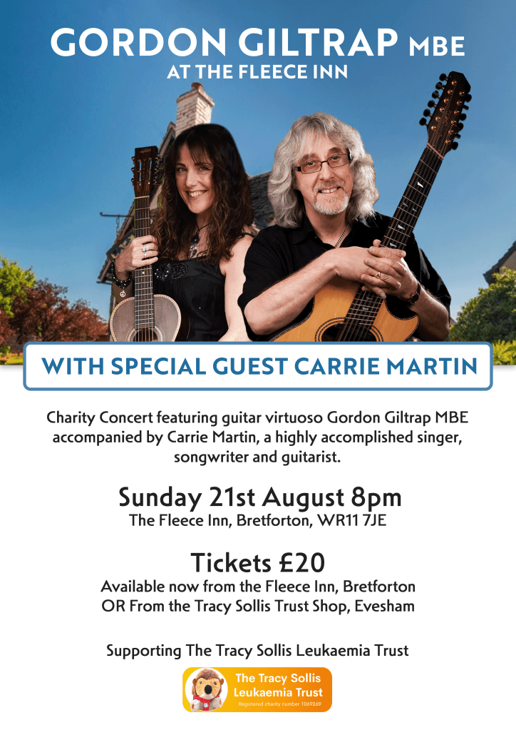 A huge thank you to our Patron Gordon Giltrap who organised this special fundraiser which took place at the Fleece Inn, Bretforton on 21st August 2022. The evening commenced with the highly accomplished singer/songwriter and guitarist Carrie Martin and later in the evening keyboard musician,Adam Parrish, accompanied Gordon. All performances were truly outstanding!